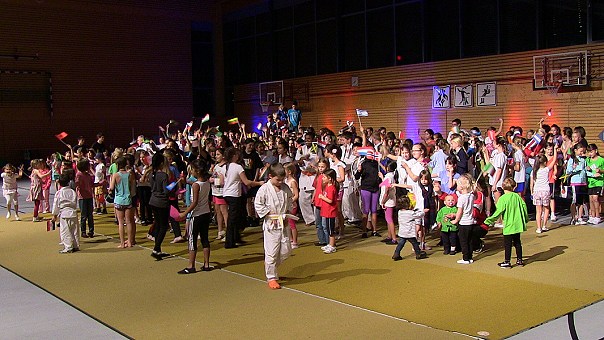 In zweieinhalb Stunden turnsportlich um die Welt Finale mit bunten Länderfähnchen. (Foto: Hubert Richter)Mehr Bilder (Klicken zum Vergrößern):