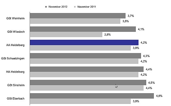 Es wird auf dem Arbeitsmarkt spürbar ruhiger Arbeitslosenquoten im November. (Grafik: Bundesagentur für Arbeit)(bro) (aa) Von Oktober auf November ist die Zahl der arbeitslosen Menschen im Bezirk der Agentur für Arbeit Heidelberg um zwölf auf 14.541 gesunken. Gegenüber dem Vorjahr nahm die Arbeitslosigkeit um 1.354 zu. Die Arbeitslosenquote im November beträgt wie im Oktober 4,2 Prozent.