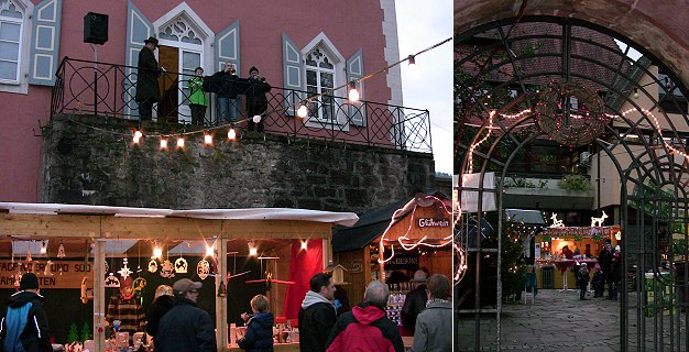 Heimelige Atmosphäre zu Füßen des Pulverturms (Fotos: Claudia Richter)(cr) Heute Nachmittag wurde in Eberbach der Weihnachtsmarkt von Bürgermeister Bernhard Martin zu den Klängen der Bläser des Fanfarenzugs eröffnet. Noch bis Sonntag herrscht auf dem Thononplatz und im Ephratahof vorweihnachtliche Stimmung.