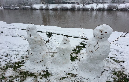 Auf der Neckarwiese steht eine ganze Schneemannfamilie (Foto: privat)(hr) Der erste Schnee, der sich heute pünktlich zum ersten Advent in Eberbach einstellte, wurde auf der Neckarwiese gleich kreativ genutzt: An der B 37 winkt eine ganze Schneemannfamilie den Autofahrern zu.
