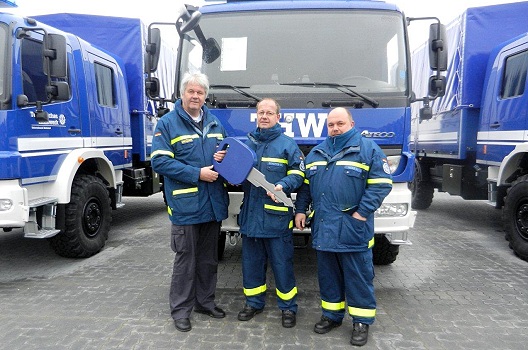 Aus den Händen von Albrecht Broemme, Präsident des THW, erhielten Ulrich Schaffer und Markus Haas dann symbolisch den Schlüssel für das Fahrzeug.