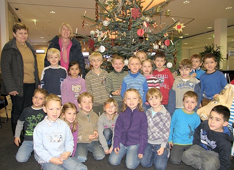 Regenbogenkinder sorgen für weihnachtliche Stimmung (Foto: privat)(bro) (sch) Die Schulanfänger/-innen des evangelischen Regenbogenkindergartens und ihre Erzieherinnen brachten ihren selbst gebastelten Weihnachtsbaumschmuck am 4. Dezember in die Hauptgeschäftsstelle Eberbach der Volksbank Neckartal.