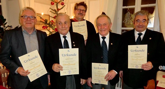 Uner Bild zeigt v.l. Friedel Raab, Karlheinz Riedinger, Theo Wäsch sowie die neuen Ehrenmitglieder Erwin Geisler und Ludwig Neuer.