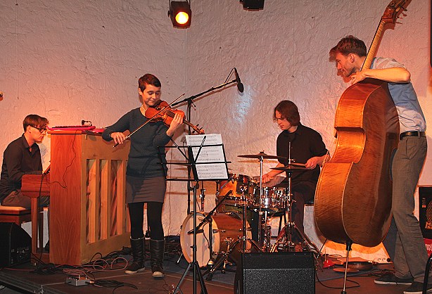 Jazz mit Folklore-Elementen begeisterte die Zuhörer Ungewöhnliche Instrumentierung bei "Slavicon" mit Clemens Pötzsch (Klavier, Zither), Alina Gropper (Geige), Florian Lauer (Schlagzeug ) und Eugen Rolnik (Kontrabass) bei ihrem Gastspiel in der Galerie Artgerecht. (Foto:Wörner)(tw) Am Freitagabend gastierte Clemens Pötzsch mit seiner neuen Formation "Slavicon" aus Dresden auf Einladung des Kulturlabor Eberbach e.V. in der Galerie Artgerecht.