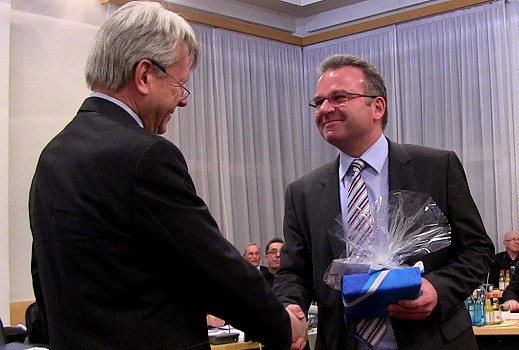 Letzte öffentliche Sitzung nach 16 Jahren (Foto: Hubert Richter)(hr) Hinter dem nüchtern wirkenden Tagesordnungspunkt 14 "Schlussworte" der heutigen Gemeinderatssitzung verbarg sich nicht weniger als der Abschied des Eberbacher Stadtparlaments von Bürgermeister Bernhard Martin nach 16 Jahren gemeinsamer Kommunalpolitik.