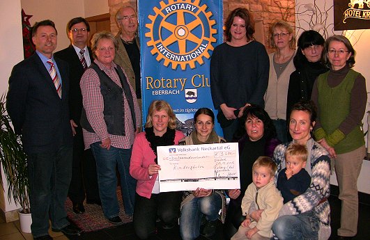 Vertreterinnen von acht Kindergärten erhielten von Rotary-Präsident Prof. Dr. Dietmar Polzin und seinen Clubkollegen Prof. Dr. Bodo Henningsen und Udo Backfisch jeweils 400 Euro, die zweckgebunden eingesetzt werden sollen. Im Vorfeld durften die Kindergartenleiterinnen bei den Rotarieren Vorschläge einbringen, was sie mit einer eventuellen Spende für ihr Haus anschaffen würden. Der Rotary-Vorstand wollte eigentlich die besten Projekte aussuchen und diese fördern, so Polzin und Henningsen. Da aber alle Ideen gut gewesen seien, habe man sich für die Unterstützung aller acht Vorschläge entschieden, stellte der Präsident fest. Polzin, selbst Vater von drei Kindern, evangelischer Kirchengemeinderat und beratendes Mitglied im Eberbacher Verwaltungs- und Finanzausschuss, habe einen Einblick in die finanzielle Situation der Eberbacher Kindergärten, schätze die Arbeit der Erzieherinnen sehr und sehe diese Spende als gute und sinnvolle Mittelverwendung an. Kinder frühzeitig in den verschiedensten Bereichen zu fördern sei, so Henningsen, "eine nachhaltige Geldanlage". Von ihm kam auch die Idee in diesem Jahr Kindergärten mit einer Spende zu unterstützen.