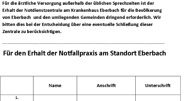 Im Oktober hatte der Eberbacher Gemeinderat sich mit einem beschlossenen Positionspapier für den Erhalt der Notfallpraxis ausgesprochen. Hierfür setzen sich unter anderem nun auch die niedergelassenen Ärzte in Eberbach, Beerfelden, Rothenberg, Hirschhorn und Waldbrunn ein. So liegen seit einiger Zeit in den Praxen Unterschriftenlisten aus, mit denen der Erhalt des ärztlichen Bereitschaftsdienstes gefordert wird (unser Bild).