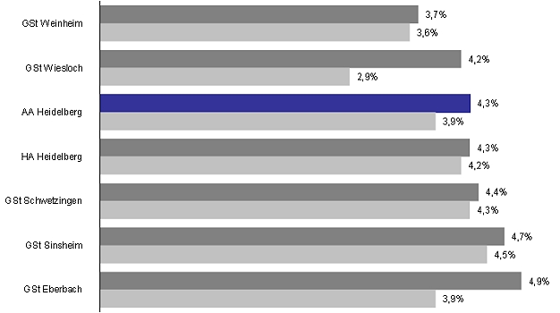 Eberbach wieder an der Spitze der Arbeitslosigkeit im Bezirk Die Arbeitslosenquoten im Dezember 2012 in den einzelnen Geschäftsstellen der Agentur für Arbeit heidelberg. Hellgrau die Quoten vom Dezember 2011. (Grafik: Agentur für Arbeit)(hr) (aa) Die Zahl der arbeitslosen Menschen im Bezirk der Arbeitsagentur Heidelberg ist im Dezember geringfügig gestiegen. Ein solcher Anstieg ist aufgrund von Kündigungsterminen zum Jahresende und dem Ende von befristeten Beschäftigungsverhältnissen nicht ungewöhnlich.