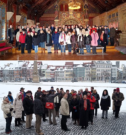 Eine kleine Auszeit vor dem Probenbeginn Oben: Was hätte es für die passionierten Zwingenberger Festspielchorsänger Schöneres geben können, als im Festsaal der Wartburg zu Klängen aus Wagners „Tannhäuser“ für ein Foto zu posieren? Unten: Beim Stadtrundgang durch Erfurt: eine Gruppe des Zwingenberger Festspielchors auf dem Domplatz. (Fotos: privat)(bro) (bnc) Am vergangenen Wochenende, 19. und 20. Januar, war es wieder soweit: Bevor in Kürze für die Sängerinnen und Sänger des Chors der Schlossfestspiele Zwingenberg die Vorbereitungen auf die neue Spielzeit beginnen, stand einmal mehr die traditionelle gemeinsame Auszeit auf dem Programm. Erfurt hieß diesmal das Ziel der zweitägigen Tour, die Vize-Chorsprecher Dieter Müller wieder minutiös und zur ungetrübten Freude aller vorbereitet hatte.