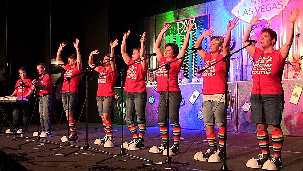 Glamour und närrische Unterhaltung in Las Vegas Zwitschern statt Twittern: die "Gässelspatzen" besangen Pleiten und Erlebnisse ihrer Mitbürger. (Foto: Hubert Richter)Mehr Bilder (Klicken zum Vergrößern):