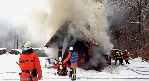 Kurz nach 11 Uhr geriet die so genannte "Kleeberghütte" auf Schwarzacher Gemarkung in Vollbrand. Die Feuerwehr Schönbrunn war mit allen Abteilungswehren vorort und wurde von der Feuerwehr Neunkirchen unterstützt. Dennoch konnte nicht verhindert werden, dass die Hütte vollständig zerstört wurde. Personen kamen nicht zu Schaden. Die Brandursache ist noch nicht abschließend geklärt. Vermutlich ist das Feuer aber im Bereich des Hüttenofens entstanden, der am Morgen eingeheizt worden war. Der Sachschaden dürfte im unteren fünfstelligen Eurobereich liegen.