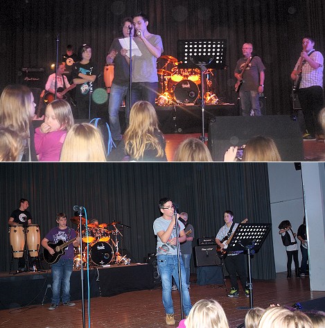Die Schulband begeisterte mit dem AC/DC-Klassiker "T.N.T.". Sie hat aber auch viele neue Popsongs der Charts in ihrem Programm. Einige der Nachwuchsmusiker standen zum ersten Mal vor größerem Publikum auf der Bühne. Der Auftritt wird den jungen Musikern von "R2/D2" als wertvolle Erfahrung in Erinnerung bleiben und sie zu weiteren musikalischen Taten motivieren.