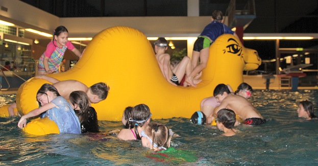 Kindern, die mit bunten T-Shirts, Nachthemden und Kittelschürzen verkleidet waren, sorgten für ein farbenfrohes Bild im Hallenbad. Dabei stand nicht der sportliche Charakter im Vordergrund, sondern das ausgelassene Herumtollen im Wasser. Zahlreiche Wasserspiele rundeten das Faschingsschwimmen ab. Ein besonderes Highlight für Jung und Alt war das aufblasbare Kamel Nelly.
