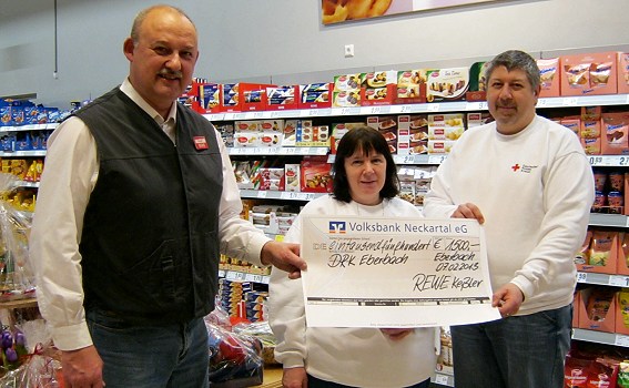 Wie schon bei den Grillfesten stockte Gerhard Keßler den Reinerlös auf die runde Summe von 1.500 Euro auf, die er der DRK-Bereitschaft Eberbach spendete. Die DRK-Bereitschaft Eberbach finanziert sich nur durch Spenden und bedankte sich daher ganz besonders bei dem Marktleiter und seinen Mitarbeitern für ihr Engagement und die gute Zusammenarbeit, ohne die diese Spende nicht zusammengekommen wäre. Die Bereitschaft möchte mit dem Geld dringend benötige Anschaffungen - wie z.B. Speisewärmer, Zeltleuchten, Hockerkocher - durchführen.