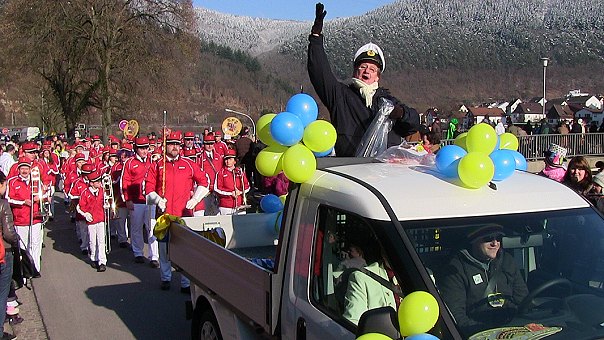 Bunter Gaudiwurm mit und ohne Hirschgeweih Der Zugleitungswagen mit Sitzungsmoderator Horst Kern, dahinter der Spielmanns- und Fanfarenzug Waibstadt. (Foto: Hubert Richter)Mehr Bilder (Klicken zum Vergrößern):