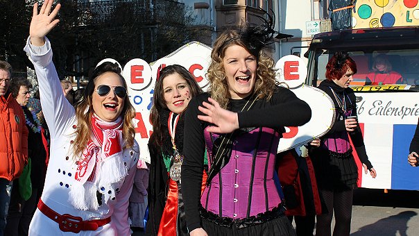 Unter der Regie der Carnevalgesellschaft "Hirschhorner Ritter" zog der Gaudiwurm mit rund 95 Zugnummern am Nachmittag von der Ersheimer Straße über die Schleusenbrücke und durch die Altstadt über den Freien Platz in die Neckarsteinacher Straße. Doris Heckmann und Hans-Jürgen Waibel kommentierten den Umzug für die Zuschauer am Freien Platz.