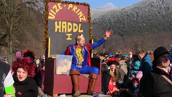 Unter der Regie der Carnevalgesellschaft "Hirschhorner Ritter" zog der Gaudiwurm mit rund 95 Zugnummern am Nachmittag von der Ersheimer Straße über die Schleusenbrücke und durch die Altstadt über den Freien Platz in die Neckarsteinacher Straße. Doris Heckmann und Hans-Jürgen Waibel kommentierten den Umzug für die Zuschauer am Freien Platz.
