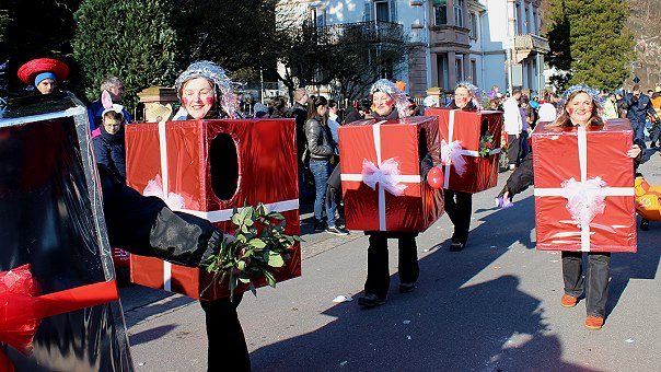Unter der Regie der Carnevalgesellschaft "Hirschhorner Ritter" zog der Gaudiwurm mit rund 95 Zugnummern am Nachmittag von der Ersheimer Straße über die Schleusenbrücke und durch die Altstadt über den Freien Platz in die Neckarsteinacher Straße. Doris Heckmann und Hans-Jürgen Waibel kommentierten den Umzug für die Zuschauer am Freien Platz.