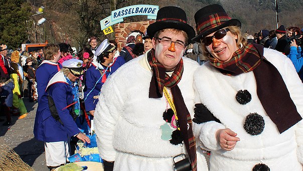 Bunter Gaudiwurm mit und ohne Hirschgeweih Zwei närrische "Schneemänner", Karibikfeeling mit den "Caipis", dahinter die Eberbacher "Rasselbande". (Foto: Claudia Richter)Mehr Bilder (Klicken zum Vergrößern):