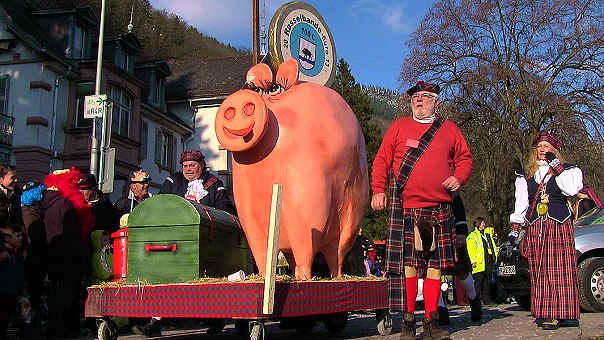 Unter der Regie der Carnevalgesellschaft "Hirschhorner Ritter" zog der Gaudiwurm mit rund 95 Zugnummern am Nachmittag von der Ersheimer Straße über die Schleusenbrücke und durch die Altstadt über den Freien Platz in die Neckarsteinacher Straße. Doris Heckmann und Hans-Jürgen Waibel kommentierten den Umzug für die Zuschauer am Freien Platz.