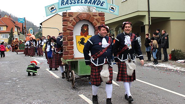 Musik steuerten außerdem die "Rondo Diavoli Gugga", die Feuerwehrkapelle Waldkatzenbach, die "Steinachfezza" und "Agilastra Spiriti" bei. Am Leopoldsplatz begrüßte KGK-Sitzungspräsident Ralph Brenneis die Umzugsteilnehmer zusammen mit Benni Müller aus dem Korb einer Arbeitsbühne in luftiger Höhe über der Friedrich-Ebert-Straße.