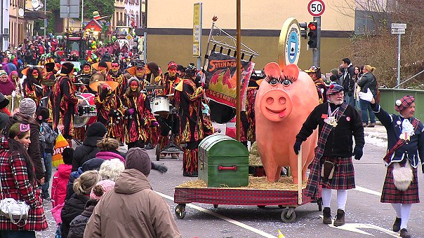 Musik steuerten außerdem die "Rondo Diavoli Gugga", die Feuerwehrkapelle Waldkatzenbach, die "Steinachfezza" und "Agilastra Spiriti" bei. Am Leopoldsplatz begrüßte KGK-Sitzungspräsident Ralph Brenneis die Umzugsteilnehmer zusammen mit Benni Müller aus dem Korb einer Arbeitsbühne in luftiger Höhe über der Friedrich-Ebert-Straße.