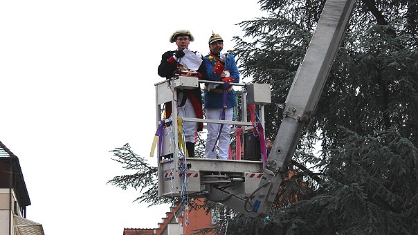 Bunter Höhepunkt und Ausklang der närrischen Zeit Benjamin Müller und Sitzungspräsident Ralph Brenneis (v.l.) begrüßten die Umzugsteilnehmer aus luftiger Höhe am Leopoldsplatz. (Foto: Claudia Richter)Mehr Bilder (Klicken zum Vergrößern):
