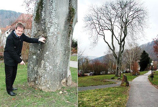Der Baum ist nicht mehr verkehrssicher Links: Bürgermeister Peter Reichert begutachtet die Schäden am Götterbaum. Rechts: Der zu entnehmende Götterbaum in der Neckaranlage - der Baum ist nicht mehr verkehrssicher. (Fotos: privat) (bro) (stve) Für Stadtgärtnermeister Björn Schmitt war er schon längere Zeit ein Sorgenkind und stand unter Beobachtung: der Götterbaum in der Neckaranlage. Aus der Distanz sieht der Exote gar nicht mal so schlecht aus, aber aus der Nähe betrachtet enthüllen sich gravierende Schäden. Der Baum weist vom Stammfuß bis zum Kronenansatz erhebliche Morschungen auf, in die holzabbauende Pilze eingedrungen sind.