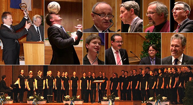 Gemeinsam die Herausforderungen in Eberbach meistern Links Peter Reichert mit Amtskette und Stadtschlüssel, daneben mit dem Fußball, den er von Stadtrat Karl Braun zugespielt bekam. Kleine Bilder oben Karl Braun, Dr. Stephan Harbarth, Thomas Funk und Landrat Stefan Dallinger, darunter Dorothea Rohland, Frieder und David Reichert, Eric Grabenbauer (v.l.). Unten der Jugendchor "Voices of Heaven". (Fotos: Hubert Richter / Claudia Richter)