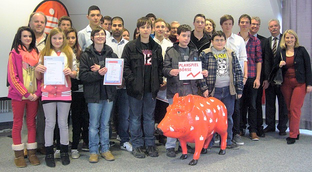 Geldgutscheine und Urkunden an alle erfolgreichen Spielgruppen überreicht (Foto: privat)(bro) (hb) Zur Siegerehrung und Preisverleihung des 30. Planspiel Börse konnte Regionaldirektor Karlheinz Emig kürzlich neben den SchülerInnen als Hauptakteure auch betreuende Lehrer und Schulleiter begrüßen.