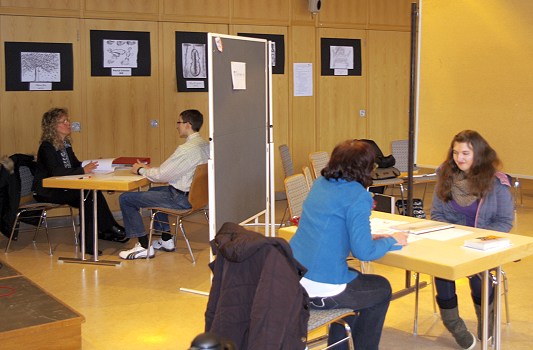 Ready-Steady-Go - Bewerbungsgespräche mit Betriebsvertretern Simulierte Bewerbungsgespräche mit Ausbildungsvertretern in der Aula der Theodor-Frey-Schule. (Foto: privat)(bro) (gsp) "Ready-Steady-Go“, so hieß es am Dienstag, 26. Februar, an der Theodor-Frey-Schule für gut 30 interessierte Schüler aus dem Berufsvorbereitungsjahr und der Zweijährigen Berufsfachschule für Metall und Wirtschaft. Gemeint ist damit ein Bewerbertraining unter realen Bedingungen, das von Jugendberufshelferin Tanja Merkert und von Klassenlehrerin Gertraud Springer organisiert wurde.
