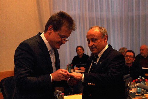 Herbe Kritik an Stadtwerkechefs - Gleitschirmstartplatz abgelehnt Bürgermeister Peter Reichert zeichnete CDU-Stadtrat Karl Braun (r.) mit dem Ehrenring aus. (Foto: Hubert Richter) (hr) Die Verabschiedung des städtischen Haushaltsplans und des Wirtschaftsplans der Stadtwerke für 2013 stand im Mittelpunkt der heutigen öffentlichen Sitzung des Eberbacher Gemeinderats.
