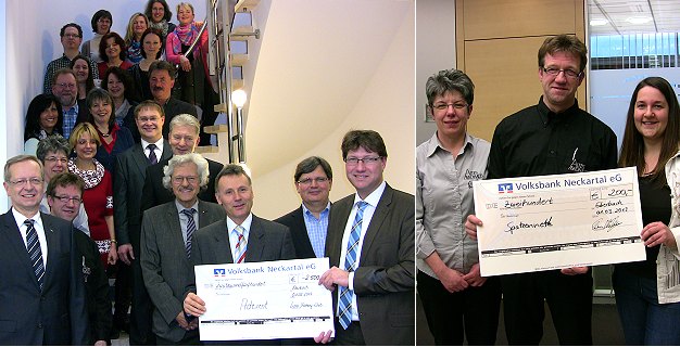 Der Gesamterlös belief sich laut der Club-Präsidenten Jörg Kaschper (Lions) und Prof. Dr. Dietmar Polzin (Rotary) auf über 2.200 Euro. Diesen Betrag habe man aufgestockt und könne somit allen Institutionen jeweils 250 Euro überreichen, freuten sich die Präsidenten. Vertreterinnen und Vertreter des MGV Concordia Neckarwimmersbach, der Kindergärten Arche Noah, Regenbogen, St. Elisabeth, St. Josef und St. Maria, des Chors "Right Now!", der Sing- und Spielschar - Orff Instrumentarium, den Chören der Dr.-Weiß-Grundschule und Steige-Grundschule, der Realschulgruppe Eberbach, des Evangelischen Posaunenchors Eberbach und der Kinderkrippe "Spatzennest" durften im Beisein von Udo Backfisch (Rotary) sowie Werner Jakob und Günter Apeltauer (beide Lions-Mitglieder) das Geschenk am Nachmittag in den Räumen der Volksbank in der Bahnhofstraße entgegennehmen (Bild links).