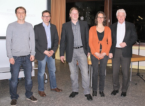 Kinder- und Jugendprojekt in Schwarzach lädt im März zu Aktionstagen ein Die Initiatoren gaben den Startschuss für die Ausweitung des Jugenfarm-Projekts. Von links: René Fabry, Steven Reres, Henning Ader, Judith Frey und Jörg Huber, Vorstand der Johannes-Diakonie. (Foto: privat)(bro) (gej) Die Initiatoren des Jugendfarm-Projekts Schwarzach hatten zu einem Informationsabend eingeladen, und viele interessierte Menschen aus den umliegenden Gemeinden füllten den Speisesaal des Schwarzacher Hofs.