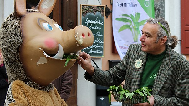 Bärlauchduft und Ostermarkt mit verkaufsoffenem Sonntag Maskottschen "Eberle" wurde von Rolf Wieprecht mit Bärlauch gefüttert. (Foto: Hubert Richter)Mehr Bilder (Klicken zum Vergrößern):