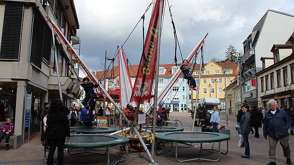 Zusätzlich hatte die Eberbacher Werbegemeinschaft heute Nachmittag einen verkaufsoffenen Sonntag organisiert. Neben Shoppingmöglichkeiten gab es in der Bahnhofstraße West waghalsige Vorführungen der Eberbacher Radsportler vom "Dirtpark Schönbrunn" (siehe Video) und der Skatergruppe. Für Livemusik sorgten die Nachwuchstalente von "J-PaMa" und "Astenics", außerdem der neunjährige Florian Roh als Straßenmusiker mit seinem Saxofon. Am Neuen Markt war eine Bungeetrampolinanlage für Kinder aufgebaut