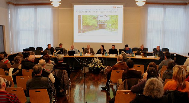 Rund 35 Zuhörer, überwiegend Ánwohner der Neckarhälde, waren in den Ratssaal gekommen. Sie erfuhren zunächst technische Details über die neue Überführung, die vor allem höher und breiter als das bisherige Bauwerk mit 2,55 Metern Durchfahrtshöhe und 3 Metern Breite werden soll. Nach dem Neubau sollen die lichte Höhe 3,60 Meter und die lichte Weite 5 Meter betragen. Darin untergebracht wird neben einer 3,50 Meter breiten Fahrbahn auch ein 1,25 Meter breiter Gehweg auf der Talseite. Dadurch sollen künftig auch Rettungs- und Feuerwehrfahrzeuge sowie reguläre Müllabfuhrwagen die Neckarhälde anfahren können. Durch die Aufweitung werden bergseits aufwändige Stützmaßnahmen mit einer Bohrpfahlwand notwendig.