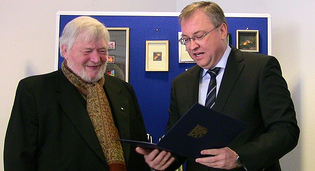 Hohe Ehrung für kommunales Engagement Karl-Heinz Schaffarczyk (l.) erhielt die Auszeichnung von Südhessens Regierungspräsident Johannes Baron. (Foto: Claudia Richter)(cr) Mit einer besonderen Auszeichnung wurde heute ein Hirschhorner Bürger geehrt. Regierungspräsident Johannes Baron überreichte in einer Feierstunde den Hessischen Verdienstorden am Bande an Karl-Heinz Schaffarczyk.