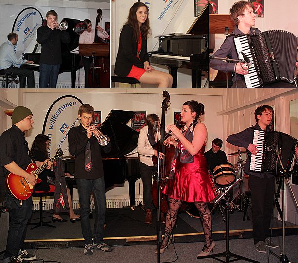 Gelungener Auftakt mit Überraschungen Oben v.l. Julius Fichtler wurde von Andreas Viehöver am Flügel und von Benedikt Held am Kontrabass begleitet. Clara Vetter am Flügel und Felix Paolo Fritschi am Akkordeon. Gemeinsame Session am Schluss mit "Autumn Leaves" . (Fotos:Wörner)(tw) In Erstauflage eines Solisten-Abends, mit Preisträgern des Landesfinales in Eberbach im vergangenen Jahr, startete gestern Abend die JazzMe-Reihe 2013 im Club 55.