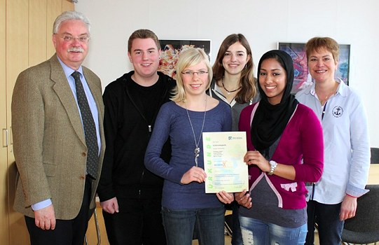 Erste Runde erfolgreich bestanden Präsentieren stolz ihre Urkunde: Marcel Theiß, Theresa Liepert, Lena Deschner und Farah Ahmed (v.l.) mit ihrer Chemie- und Biologielehrerin Vera Martin und dem Schulleiter OStD Helmut Schultz. (Foto: privat)
