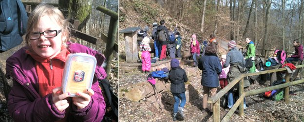 Waldquelle gesucht und Geocache gefunden (Fotos: privat)(bro) (chk) Am 16. März um 10 Uhr machten sich vom HSG-Parkplatz 17 Kinder, fünf Betreuerinnen der Naturschutzjugend (NAJU) sowie ein Praktikant mit Rucksack, Vesper, Getränken, wetterfester Kleidung und festem Schuhwerk auf den Weg, um die Waldquelle zu entdecken.