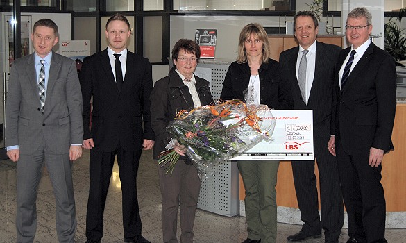 Hauptgewinn ging nach Eberbach V.l.: Bezirksdirektor Volker Grimm, Finanzassistent Steffen Grimm vom Büro Eberbach, die Gewinnerin Ruth Veit, Barbara Bettinghausen vom LBS Büro Eberbach, Bezirksleiter der LBS in Eberbach Klaus Sywyj sowie der Regionaldirektor der Sparkasse Karlheinz Emig. (Foto: privat)(bro) (ks) Beim Gewinnspiel "Adventskalender 2012" der Landesbausparkasse Baden-Württemberg ging der Hauptgewinn nach Eberbach. Über einen Einkaufsgutschein in Höhe von 1.000 Euro konnte sich Ruth Veit freuen. Den Gewinn übergaben die örtlichen Vertreter der Landesbausparkasse und der Sparkasse Neckartal-Odenwald kurz vor Ostern an die glückliche Gewinnerin.