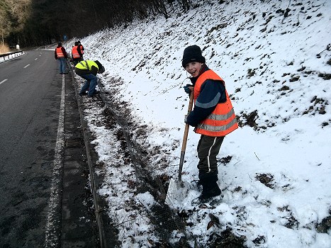 Morgens um 9 Uhr mit ausreichend Werkzeug, dicken Jacken und Handschuhen ausgerüstet, führte der Weg zuerst zum städtischen Baulager. Dort wurde man schon von einem Mitglied des BUND erwartet, um beim Einladen des Baumaterials zu helfen. An der richtigen Stelle angekommen, wurde das Material und die Aufgaben verteilt. Auch wenn das Wetter nicht die besten Bedingungen stellte, wie anfangs mit minus 5°C und durchgehend gefrorenem Boden, wurde doch mit Freude und Fleiß daran gearbeitet, den Boden aufzugraben, den Zaun auszulegen und später ordentlich zu befestigen. Die Kinder und Jugendlichen bewiesen viel Ausdauer und zeigten vor allem beim Ausheben des Grabens, was in ihnen steckt. Auch das Aufstellen des Zaunes war nicht minder fordernd: Dabei wollten fast 800 Metallstangen an der richtigen Stelle in den teilweise steinigen Boden gehämmert werden. Doch schon nach knappen fünf Stunden war die anstrengende Arbeit vollbracht. Auf beiden Seiten der Straße standen nach der Mittagspause die zwei Zäune, die die Kröten davor bewahren werden, auf ihrem Weg zum Laichplatz den gefährlichsten Teil ihrer Strecke aus eigener Kraft zu überqueren.