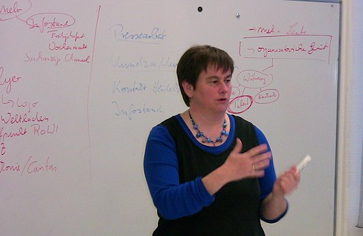Talente statt Geld - Dienstleistungen im Kreisverkehr Barbara Coors stellte die Tauschring-Idee vor. (Foto: Claudia Richter)(cr) Im Dezember vergangenen Jahres wurde bei einer Veranstaltung der Volkshochschule Eberbach-Neckargemünd (VHS) ein Tauschring vorgestellt. Jetzt trafen sich Interessierte, um in Eberbach eine Tauschbörse ins Leben zu rufen.