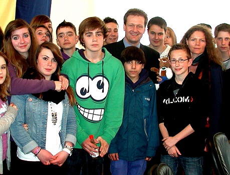 Premiere für Bürgermeister Peter Reichert Bürgermeister Peter Reichert ist bestens gelaunt inmitten der französischen Schülergruppe. Auf dem Bild re. vom Bürgermeister: Tiphène Demiaux. (Foto: privat)(bro) (stve) Seit 1961 besteht die Städtepartnerschaft zwischen Thonon und Eberbach, und seit 40 Jahren erfolgen die wechselseitigen Besuche von Schulklassen. Für Bürgermeister Peter Reichert indes war der traditionelle Schülerempfang von 27 jungen Franzosen des Collège Champage und ihrer Austauschschülerinnen und Schüler des Hohenstaufen-Gymnasiums eine Premiere.