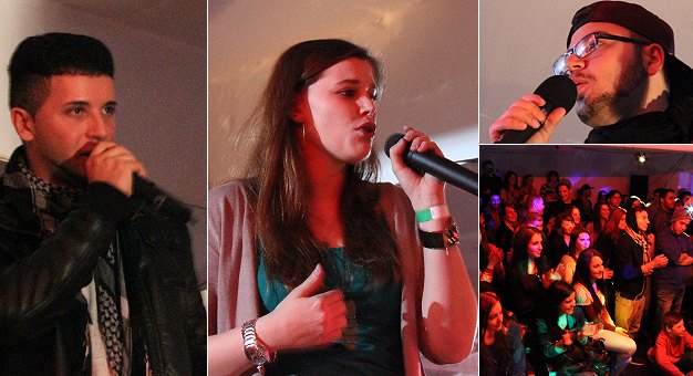 Junge Rapperin reimte am besten V.l. der Heidelberger Rapper D-Sad, Battle-Siegerin "Encima", Moderator Hakan Özdemir und ein Blick in den gut gefüllten Besucherraum. (Fotos: Hubert Richter)(hr) Zur "Hip Hop Session" hatte der Postillion-Jugendtreff in Eberbach am Freitagabend in den Keller der Dr.-Weiß-Schule eingeladen.