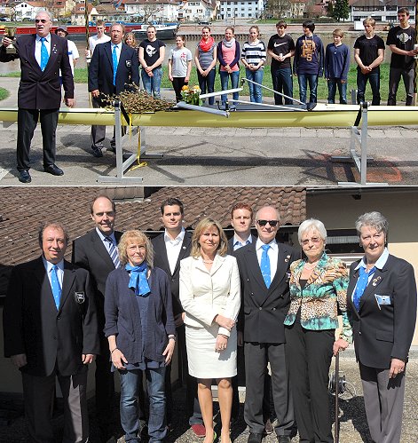 Anrudern mit Ehrungen und Bootstaufe bei schönstem Frühlingswetter Oben: Ein neuer Einer wurde getauft. Unten: Für langjährige Vereinszugehörigkeit geehrt wurden: Dr. Andreas Schmelz, Dr. Boris Mayer, Gaby Mayer, Axel Mayer, Gunter Mayer und Ilse Mayer mit dem geschäftsführenden Vorstand: Dirk Scheuenpflug, Claudia Rupp (v.li.) und Theresia Wagner (re.). (Fotos: privat)(bro) (ewa) Anrudern, Sonntag und der erste warme Sonnentag in diesem Jahr. Da durfte sich die RGE über viele Besucher freuen.