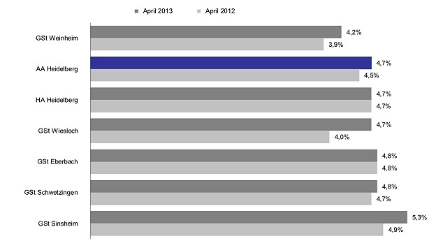 Frühjahrsbelebung blieb aus - Arbeitsmarkt stagniert weiterhin Arbeitslosenquoten im April. (Grafik: Bundesagentur für Arbeit)(bro) (aa) Von März auf April hat die Zahl der arbeitslosen Menschen im Bezirk der Agentur für Arbeit Heidelberg um 16 auf 16.136 abgenommen. Gegenüber dem Vorjahr ist die Arbeitslosigkeit jetzt um 897 höher. Die Arbeitslosenquote im April beträgt unverändert 4,7 Prozent.
