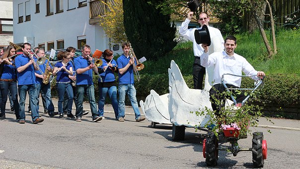 Höhepunkt war wieder der bunte Kerweumzug am Sonntagnachmittag. Mehrere Motivwagen und Fußgruppen zeigten verschiedene Themen des Ortsgeschehens (unsere Bilder). Musikalisch begleitet wurde der Umzug von der "SF Band" aus Schwarzach. Im Anschluss hielt Kerwepfarrer Peter Göhrig im Festzelt seine Rede, in der wieder einige Geschehnisse des Schwanheimer Dorflebens durch den Kakao gezogen wurden.