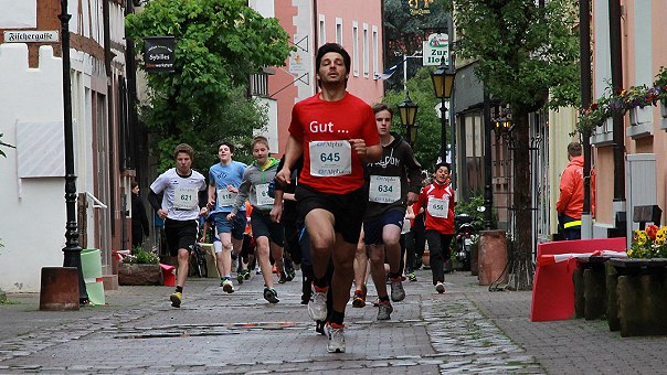 Im 10-km-Lauf war Timo Bracht dann selbst im Feld mit 137 Teilnehmern. Schon bei der Palestra-Sprintwertung nach der Altstadtrunde hatte er die Nase vorn. Die Prämie dafür will er der jungen Eberbacher Rockband "61 Inch" spenden. Im Ziel als Sieger schaffte Bracht dann sogar mit 32:26 Minuten einen neuen Streckenrekord. Schnellste Frau über 10 Kilometer war heute Annemarie Weigand vom USC Heidelberg.